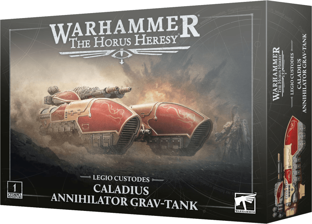 The Caladius Annihilator Grav-tank provides the Legio Custodes with a mobile, protected platform upon which to mount one of the heaviest elements of their arsenal – a twin Arachnus blaze carronade. With this fusion of advanced systems and weapons, the Caladius Annihilator is perhaps the most powerful battleline armoured unit of its size in the Imperium’s forces.