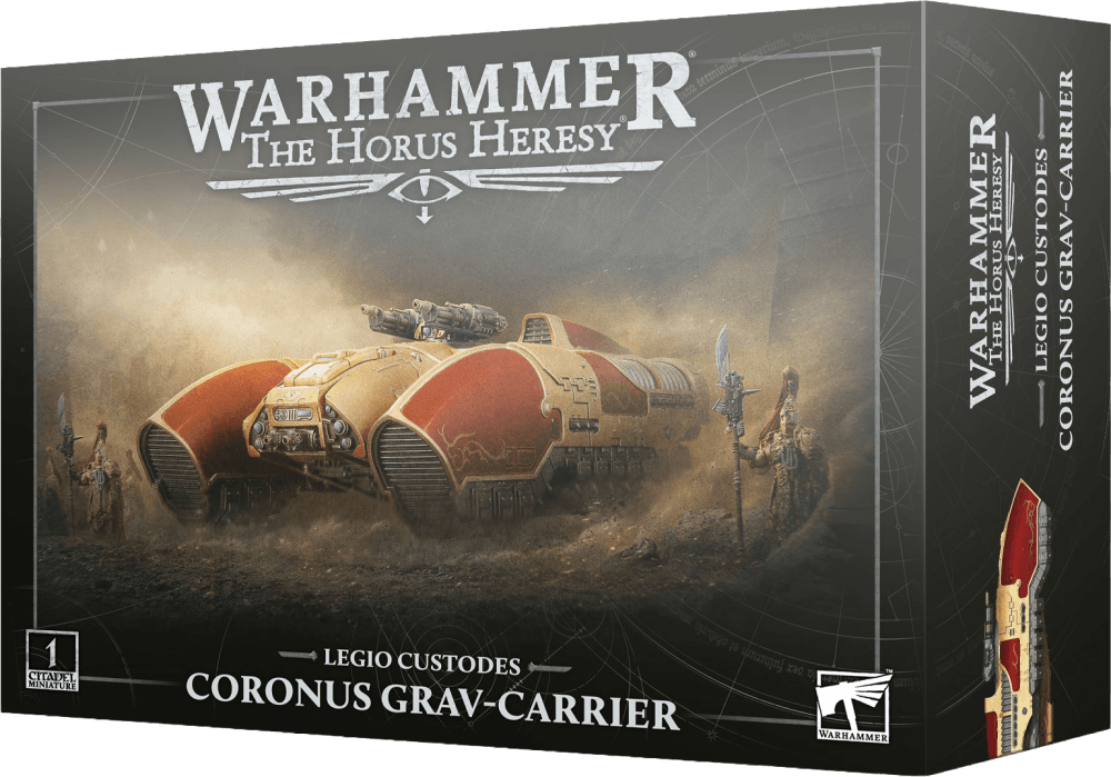 The Coronus Grav-carrier grants the Legio Custodes a degree of speed and agility unmatched by the grinding armour of the Imperium’s other hosts, allowing them to deploy, redeploy, and evade without risk of being pinned down by enemy troops or hazardous terrain. They are both the primary transport for the Sodalities of the Legio and the template upon which several other grav-craft are based.