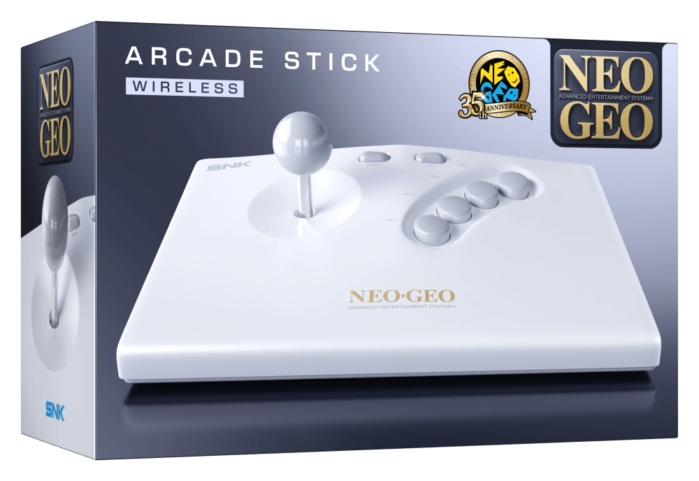 The NEOGEO AES+ Anniversary Edition includes the iconic Arcade Stick (wireless) in white, a 1:1 replica of the original stick built to mirror the control panel found on SNK's legendary MVS arcade cabinets. Designed for the NEOGEO AES+, the Arcade Stick connects natively to the console via a classic 15-pin connector wireless dongle (making it backward-compatible with the original consoles from the 90s and making the original wired Arcade Sticks from the 90s forward-compatible with the NEOGEO AES+) for an unmatched arcade experience at home. This stick is the pinnacle of arcade purity with no compromises, delivering the look, feel and fast response that defined a gaming generation.