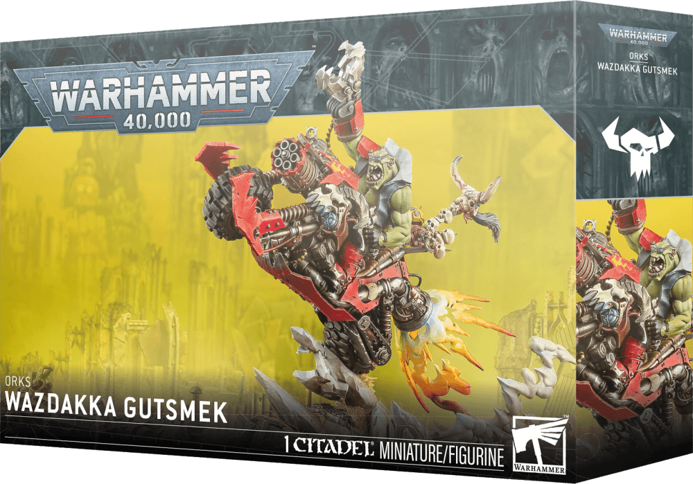 Big Revva, Gutsmek’s kustom warbike, is equipped with a psyko-gatler that can scrap even heavy infantry, and a throttlerokkit shokka engine. Wazdakka himself is armed with the grabba dragga, a unique snagga klaw he uses to drag enemies behind him, and is accompanied by Fixit da Grot, who keeps the warbike in tip-top shape.